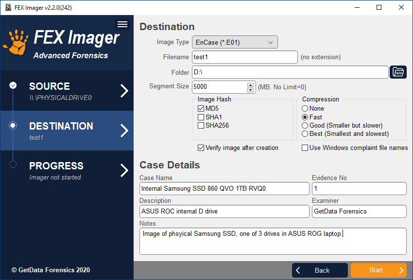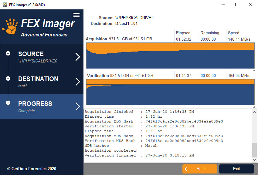 - Acquire to .E01 or DD format with MD5, SHA1 or SHA256 acquisition hash.